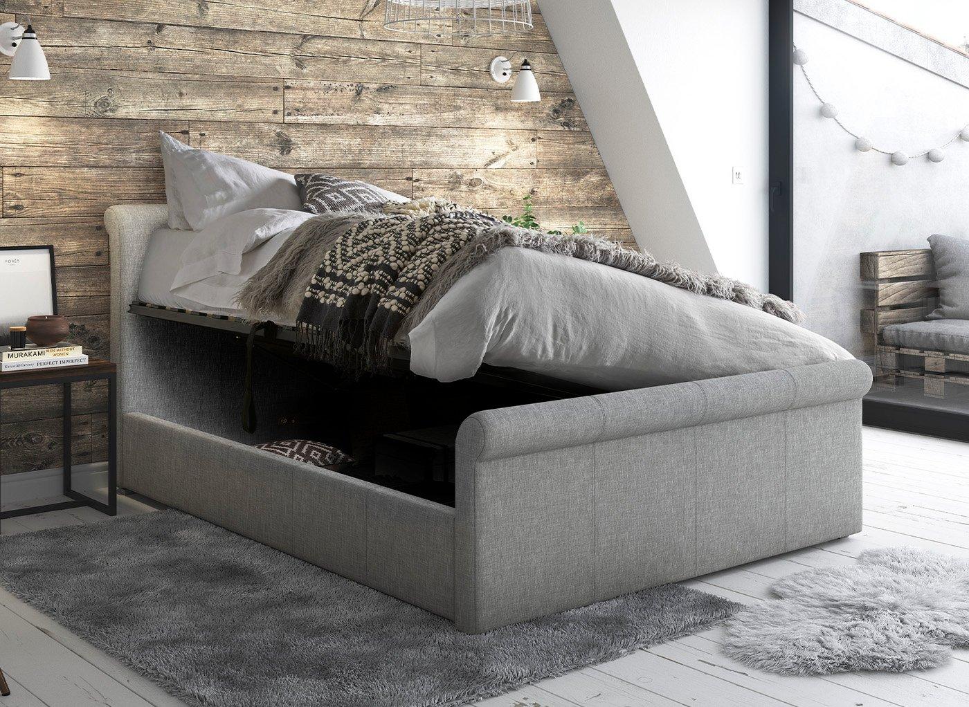 Flair Furnishings Lola Fabric Ottoman Silver Kingsize The Lola Fabric Bed Frame Consists Of A Modern Sleigh Style De Ottoman Bed Fabric Bed Fabric Bed Frame